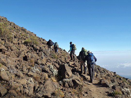 The six day Machame variation is a difficult route. In particular, day four combined with day five makes for a very hard schedule. Day four is a full day of hiking from Barranco to Barafu. Then after dinner and a partial night’s sleep, the very long and strenuous summit day begins around midnight. The 6 day Machame route requires 19-24 hours of demanding walking, at extremely high elevation, with only 4-6 hours of sleep.